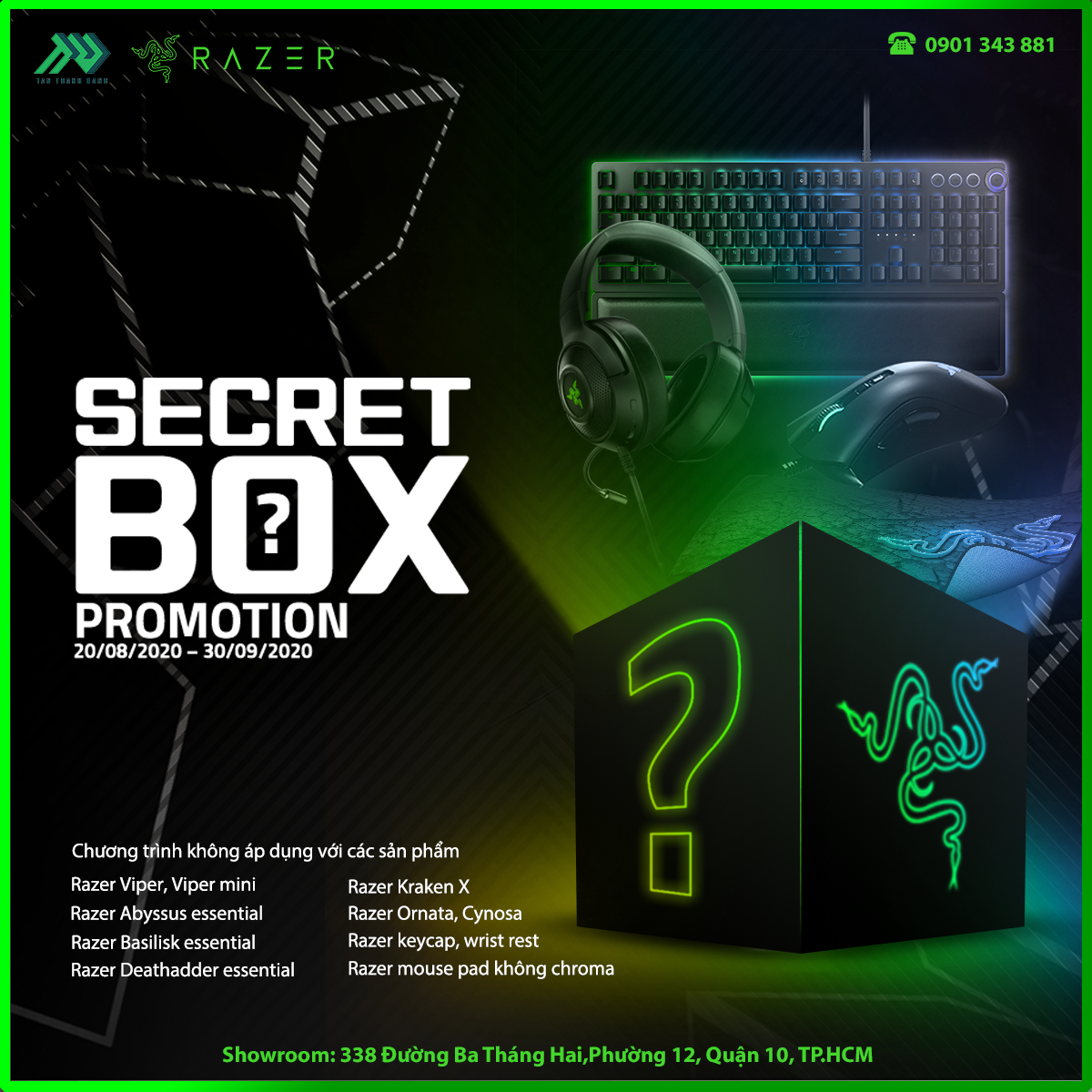 Từ 20/8/2020 – 30/9/2020, khách hàng mua 1 sản phẩm bất kỳ từ thương hiệu Razer (trừ những sản phẩm không được áp dụng đã được liệt kê trên banner) sẽ được nhận một phiếu thăm may mắn với cơ hội trúng những phần quà cực giá trị từ Tân Thành PC như: